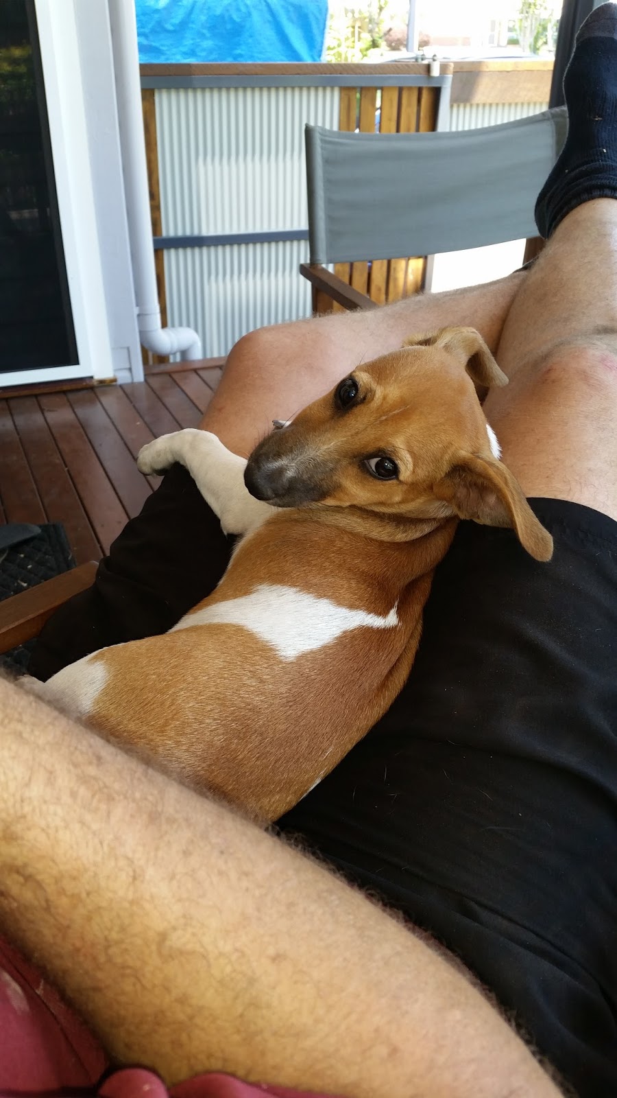 Louie has been a joy and constant source of entertainment since the day he arrived. Well, I say 'arrived' but it was actually quite a long journey to collect him. He is the short legged, short haired, variety of JR which we found really hard to find locally. Brett spotted him online with a breeder in southern Qld and when we rang, he was the only one still available so we decided it was fate. We left home at about 4am, with the breeder agreeing to meet us in Rockhampton, where we arrived around lunch time. We intended to stay overnight but sharing the driving, we ended up all the way home. About 17 hours all up. Louie was great. Slept most of the way. Slept through the night when we got home, and has done ever since.